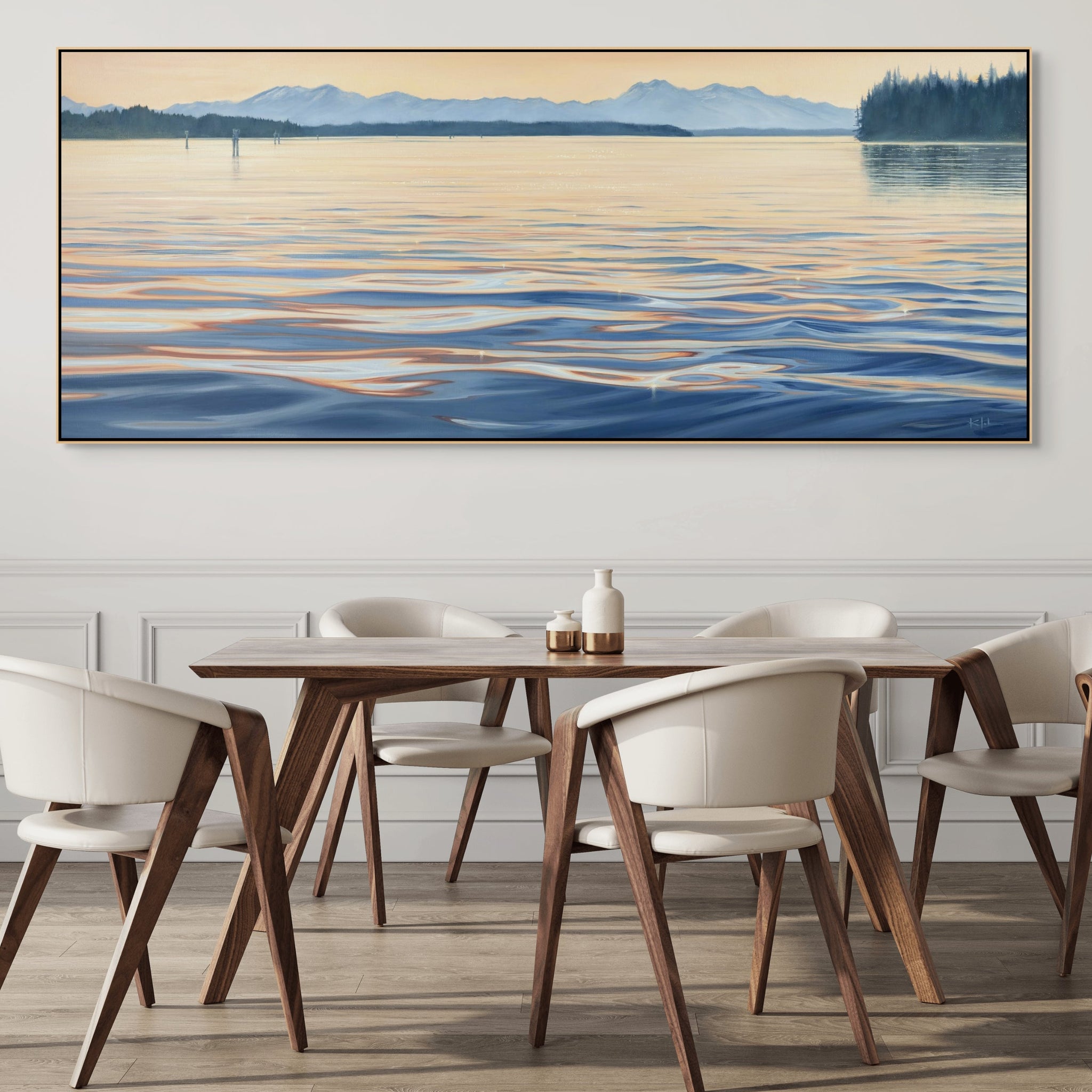 This oil painting was inspired by evenings out on the Puget Sound in Olympia, this is the view looking up the channel leaving from downtown, towards the Olympic Mountains in Budd Inlet.