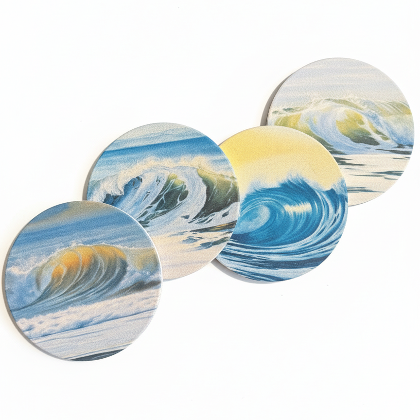 An elegant set of four ceramic coasters, each featuring an wave oil painting from Julie Kluh.