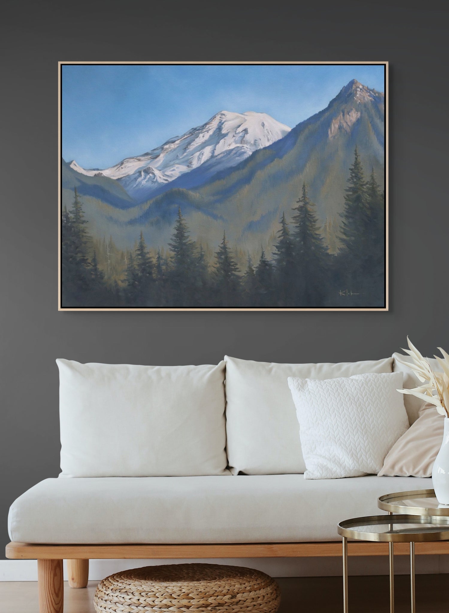 This bright landscape painting captures the majestic view of Mt. Rainier rising above the lush evergreen forests near Packwood, Washington. On a clear, sunny day, the snow-covered peak gleams against a brilliant blue sky, with Butter Butte in the foreground looking to North.